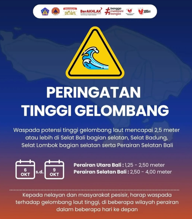 Badan Meteorologi, Klimatologi, dan Geofisika (BMKG) mengeluarkan peringatan dini terkait potensi gelombang laut tinggi yang berpotensi terjadi di sejumlah wilayah perairan Bali pada periode 6 hingga 9 Oktober 2025. Berdasarkan data prakiraan cuaca maritim, tinggi gelombang di Perairan Utara Bali diperkirakan mencapai 1,25 hingga 2,5 meter, sementara Perairan Selatan Bali berpotensi mengalami gelombang lebih tinggi, berkisar 2,5 hingga 4 meter. Kondisi tersebut berpotensi memengaruhi aktivitas pelayaran dan nelayan tradisional, terutama di wilayah-wilayah perairan terbuka. BMKG meminta masyarakat pesisir agar meningkatkan kewaspadaan, mengingat potensi gelombang di atas 2,5 meter juga berisiko terjadi di Selat Bali bagian selatan, Selat Badung, Selat Lombok bagian selatan, serta perairan lepas Selatan Bali.