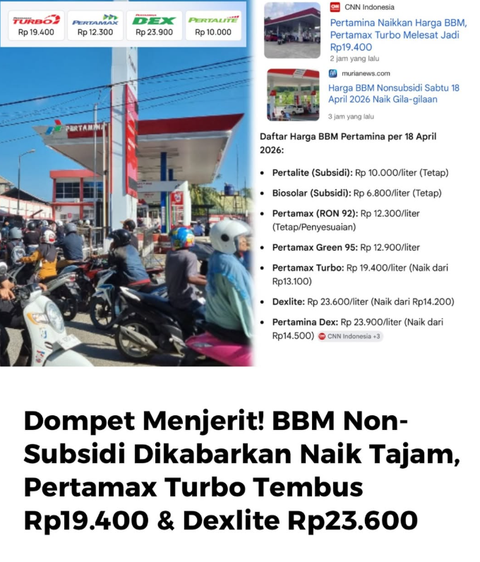 Dalam informasi yang beredar, harga BBM jenis Pertamax Turbo disebut mencapai Rp19.400 per liter, sementara Dexlite dikabarkan naik hingga Rp23.600 per liter. Angka tersebut jauh lebih tinggi dibandingkan kisaran harga sebelumnya yang berada di level Rp13 ribuan hingga Rp14 ribuan per liter. Perbedaan ini memicu reaksi dari warganet yang mempertanyakan kebenaran informasi tersebut.