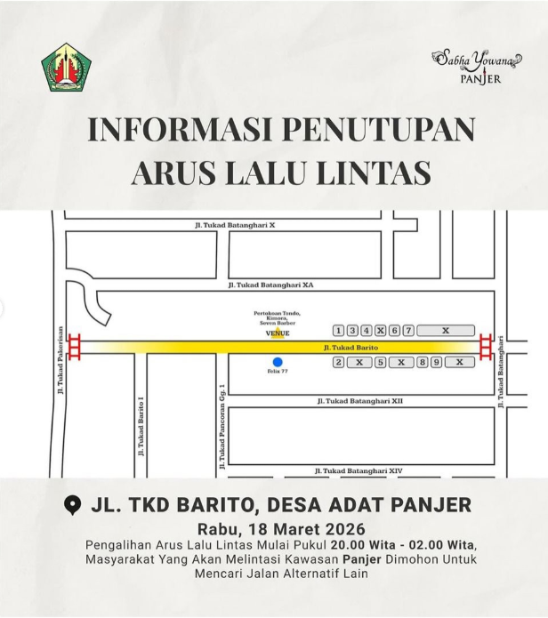 Masyarakat diimbau untuk memperhatikan pengaturan lalu lintas sehubungan dengan pelaksanaan parade ogoh-ogoh di wilayah Panjer yang akan digelar pada Selasa, 18 Maret 2026. Dalam rangka mendukung kelancaran kegiatan budaya tersebut, sejumlah ruas jalan di sekitar lokasi parade akan diberlakukan penutupan sementara. Kebijakan ini diterapkan guna memberikan ruang bagi jalannya parade serta menjaga keamanan dan kenyamanan peserta maupun masyarakat yang hadir menyaksikan acara.